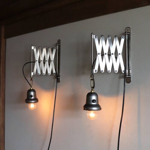 ゆらゆらと揺れるベル型カップを吊るしたシザーアームランプです。ハサミが重なったように開閉する蛇腹式のアームはシザーアームと呼ばれ、アンティークやインダストリアル照明の中でも定番の人気照明です。