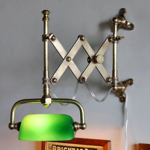 映画や洋館で見かける特徴的なグリーンのバンカーズランプをシザーアームブラケットに仕立てた貴重な蛇腹式壁掛け照明です。小ぶりのグリーンシェードにヴィンテージの照明や工業製品から取り出した真鍮パーツをふんだんに使用しました。