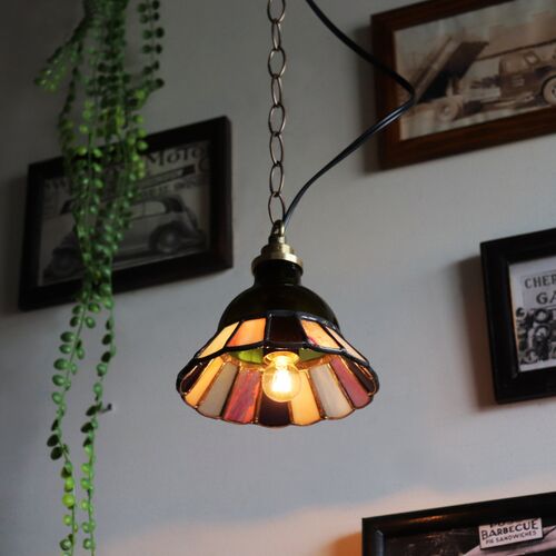 アンティークやヴィンテージの色とりどりのステンドグラスを使った小さな花型ペンダントライトです。ハンドメイドで作られた一期一会の色ガラスを大切に吊下げ照明に仕立てました。